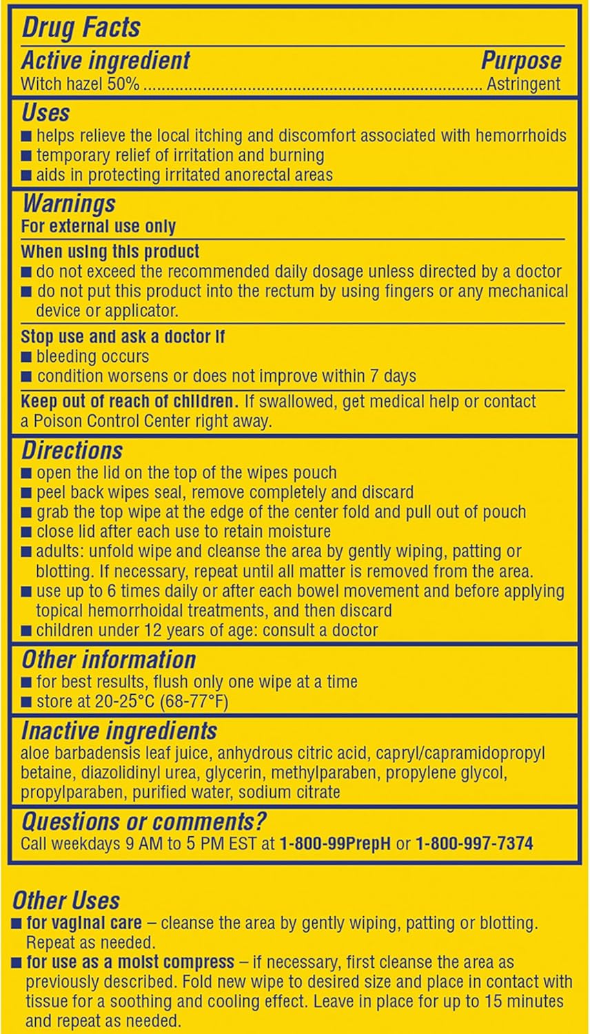 Preparation H Hemorrhoid Wipes with Witch Hazel offer soothing, cleansing relief of irritation caused by hemorrhoids. Even mild irritation around the butt can be an uncomfortable and persistent problem. When other hemorrhoid treatments aren't providing the comfort you need, these flushable, septic-safe wipes combine the relief you trust from Preparation H hemorrhoid care products with soothing aloe and cleansing witch hazel for gentle daily hemorrhoid care. These itch relief wipes also help relieve itching associated with hemorrhoids. Apply these Preparation H wipes 3-4 times daily for fast acting hemorrhoid care. Get comfortable with it, with hemorrhoid relief from Preparation H, the number 1 doctor recommended brand for hemorrhoid treatment (1). (1) Among OTC brands